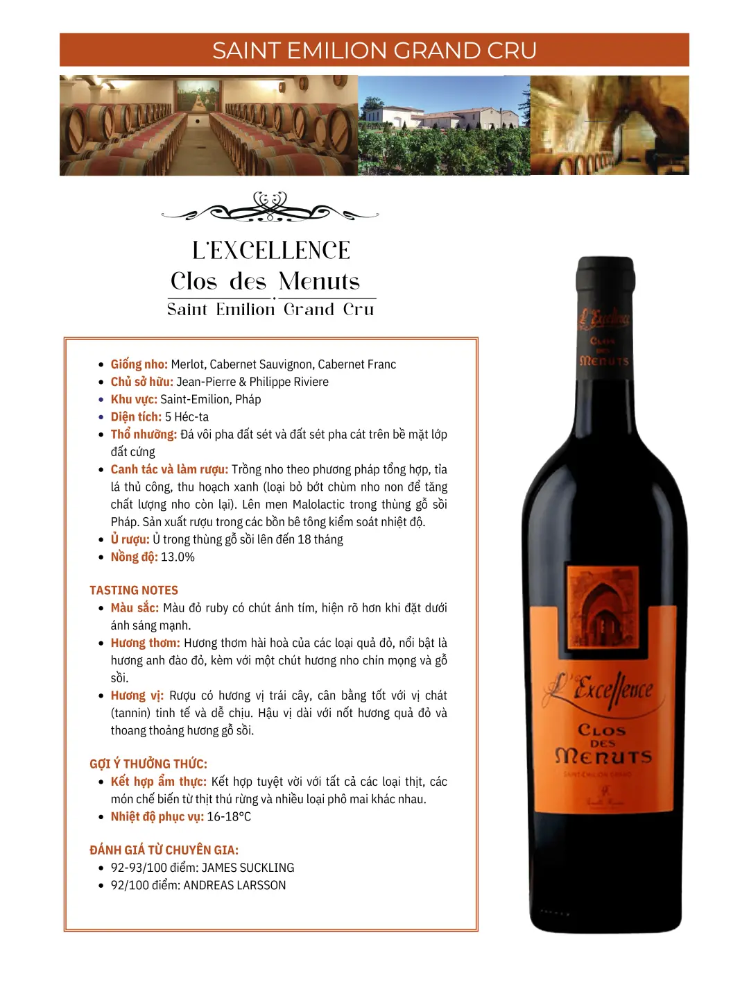 Clos Des Menuts Excellence là một loại rượu vang cao cấp đến từ tiểu vùng Saint-Émilion, thuộc vùng Bordeaux, Pháp. Đây là một chai rượu vang thuộc loại Saint-Émilion Grand Cru, nổi bật với sự tinh tế và chất lượng cao.